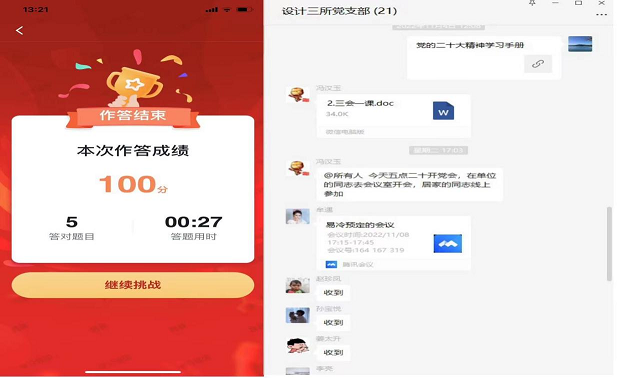 以賽促學(xué),強(qiáng)技礪能精研細(xì)琢。各黨支部組織黨員通過(guò)學(xué)習(xí)強(qiáng)國(guó)“黨的二十大精神答題活動(dòng)”“黨的二十大精神應(yīng)知應(yīng)會(huì)百題”等形式,開展線上答題競(jìng)賽,全面檢驗(yàn)黨員干部對(duì)黨的二十大報(bào)告內(nèi)容的掌握程度,進(jìn)一步增強(qiáng)黨員干部對(duì)學(xué)習(xí)黨的二十大精神的認(rèn)識(shí)和重視,推動(dòng)黨的二十大精神入腦入心,鞏固提升學(xué)習(xí)效果,以賽促學(xué)、以知促行,用黨的二十大精神武裝頭腦、指導(dǎo)實(shí)踐、推動(dòng)工作。