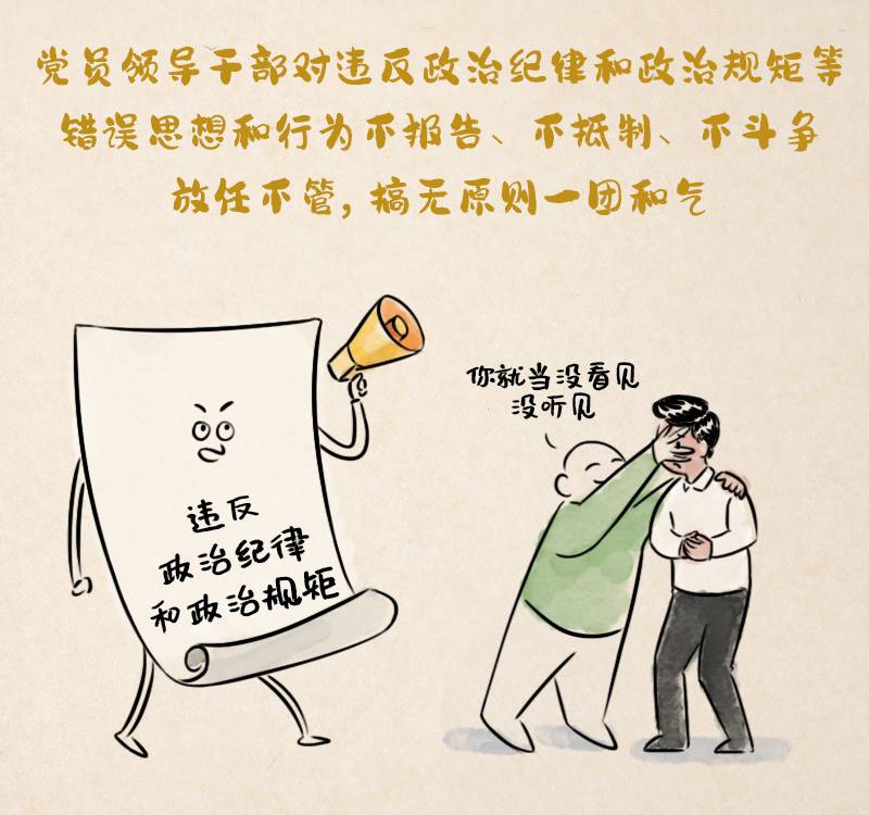 第七十五條 黨員領(lǐng)導(dǎo)干部對(duì)違反政治紀(jì)律和政治規(guī)矩等錯(cuò)誤思想和行為不報(bào)告、不抵制、不斗爭(zhēng),放任不管,搞無(wú)原則一團(tuán)和氣,造成不良影響的,給予警告或者嚴(yán)重警告處分;情節(jié)嚴(yán)重的,給予撤銷黨內(nèi)職務(wù)或者留黨察看處分。