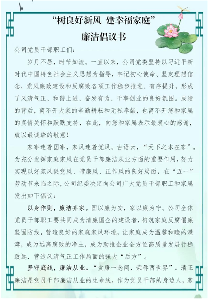 集團公司把家風(fēng)建設(shè)作為廉潔文化建設(shè)的重要一環(huán),結(jié)合文明家庭創(chuàng)建,開展家庭助廉教育,以家風(fēng)促作風(fēng),以親情促廉情。