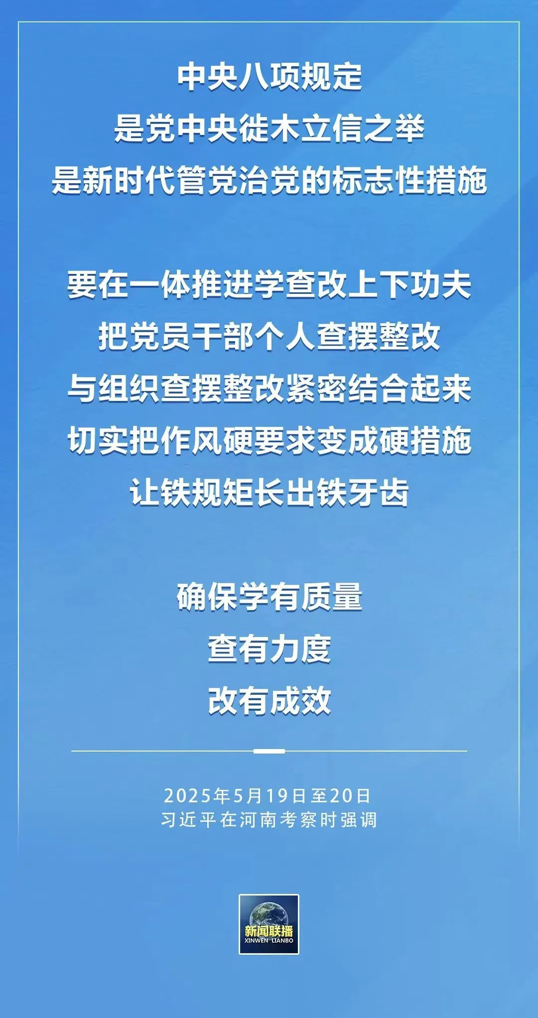 習近平總書記在河南考察時對深入貫徹中央八項規(guī)定精神學習教育提出明確要求,強調(diào)“要在一體推進學查改上下功夫”“確保學有質(zhì)量、查有力度、改有成效”。
