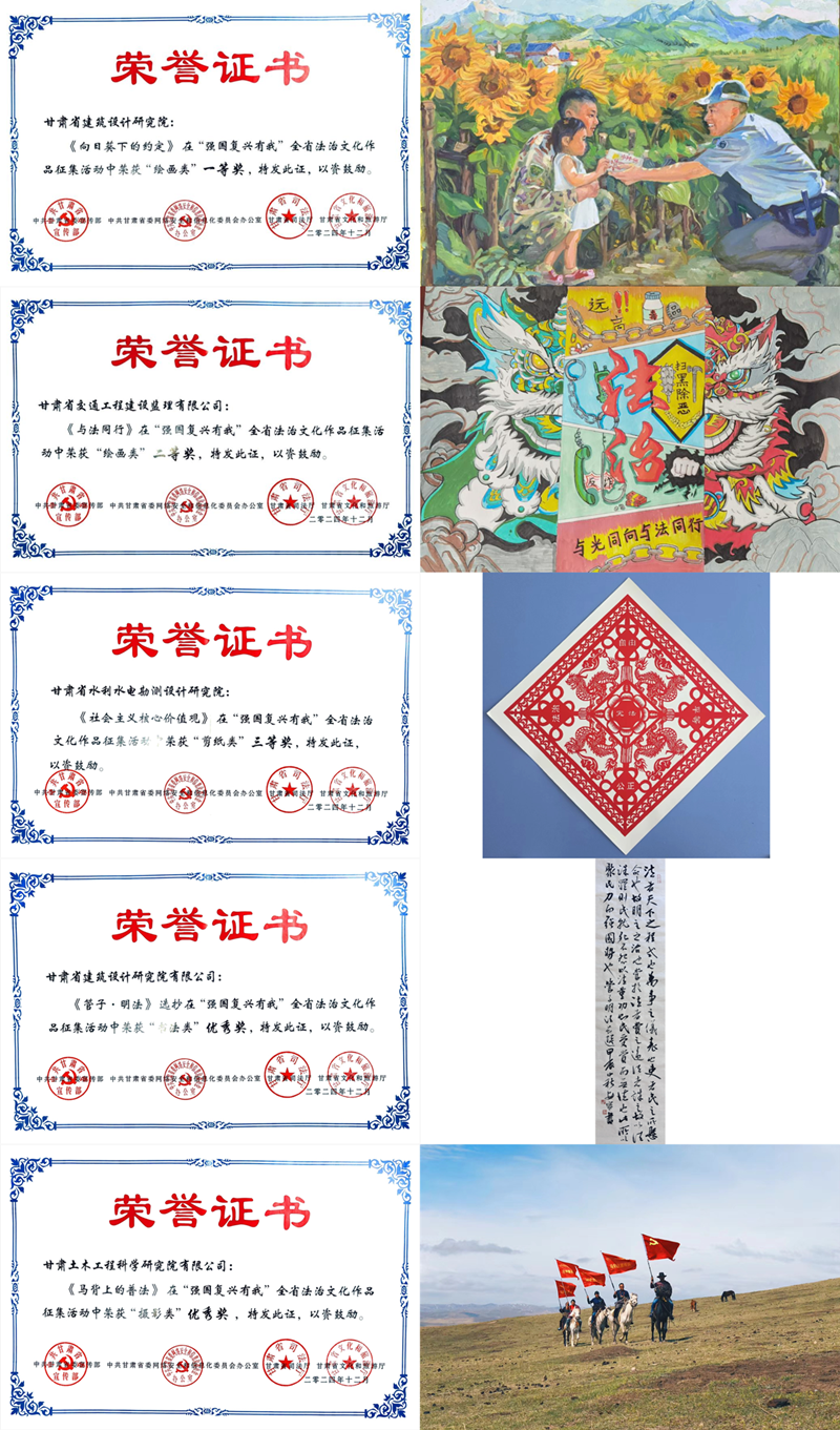 經(jīng)評選,集團多件作品脫穎而出。省建筑設(shè)計院的《向日葵下的約定》以細膩筆觸和獨特視角,獲繪畫類一等獎;省交通監(jiān)理公司的《與法同行》生動展現(xiàn)法治守護,獲繪畫類二等獎;省水電設(shè)計院的《社會主義核心價值觀》以精湛剪紙技藝,獲剪紙類三等獎;省建筑設(shè)計院的《〈管子·明法〉選抄》獲書法類優(yōu)秀獎;甘肅土木工程院的《馬背上的普法》獲攝影類優(yōu)秀獎。