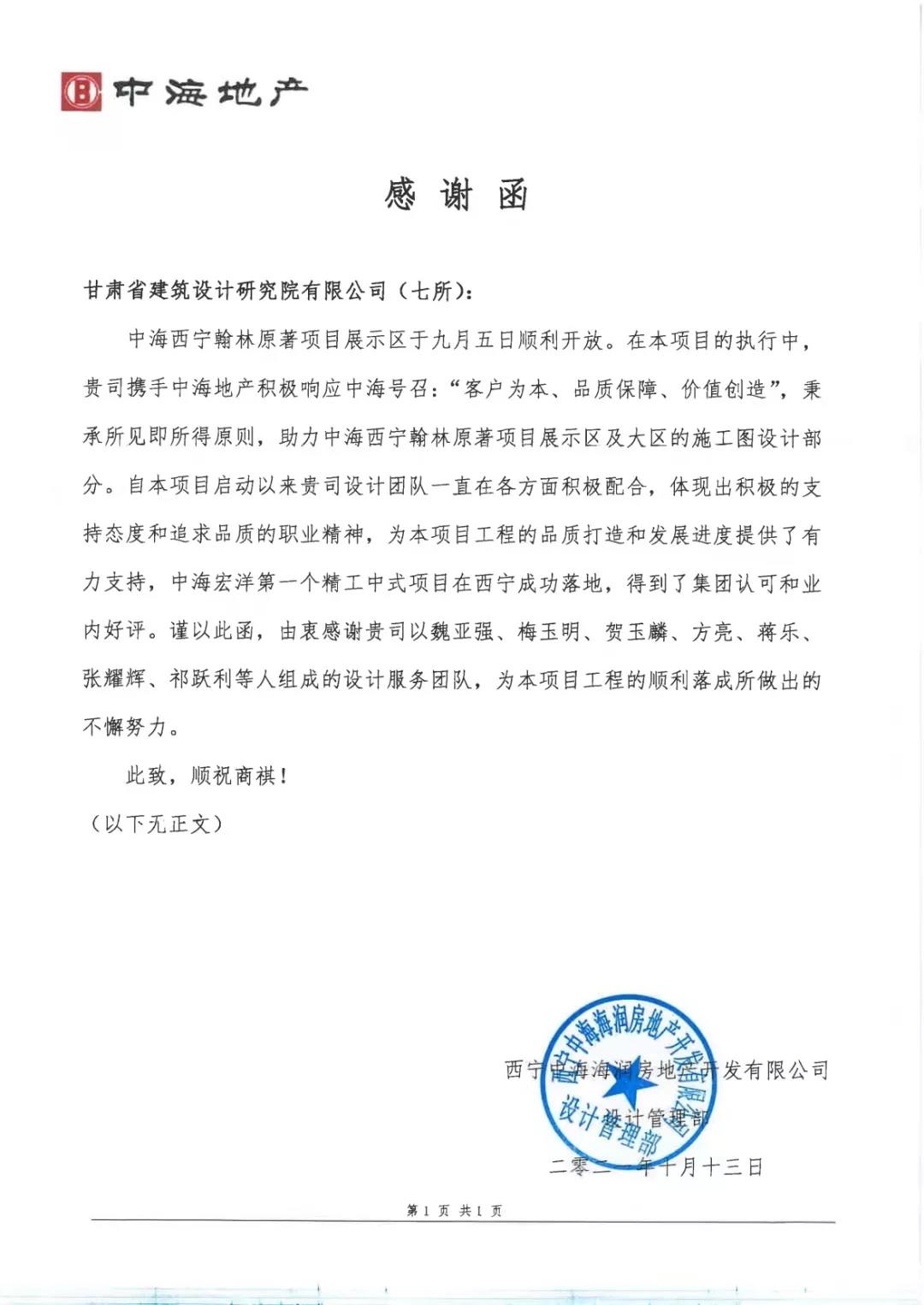 日前,建筑設(shè)計院收到來自西寧中海地產(chǎn)的一封感謝信,贊揚(yáng)設(shè)計七所魏亞強(qiáng)、梅玉明、賀玉麟、方亮、蔣樂、張耀輝、祁躍利組成的設(shè)計團(tuán)隊在中海西寧翰林原著項目展示區(qū)及大區(qū)施工設(shè)計中的突出表現(xiàn)。