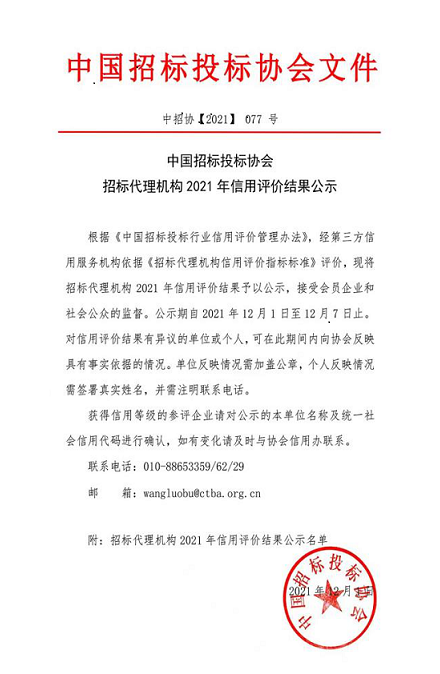 近日,在中國招標投標協(xié)會牽頭組織的2021年招標代理機構(gòu)級信用評價認證工作中,經(jīng)中招協(xié)委托的第三方信用服務(wù)機構(gòu)(國資委)商業(yè)信用中心及有關(guān)行業(yè)專家評審,招標咨詢集團子公司甘肅省招標中心有限公司和甘肅金安建設(shè)工程項目管理有限公司獲得2021年招標代理機構(gòu)AAA級信用評價最高等級認證。