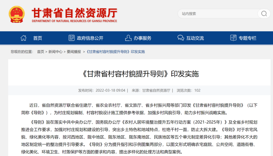 為進(jìn)一步貫徹落實(shí)中共中央辦公廳、國務(wù)院辦公廳《農(nóng)村人居環(huán)境整治提升五年行動方案(2021—2025年)》及全省鄉(xiāng)村規(guī)劃推進(jìn)會精神,由甘肅省城鄉(xiāng)規(guī)劃設(shè)計研究院有限公司牽頭,聯(lián)合甘肅省建筑設(shè)計研究院有限公司、西北師范大學(xué)城市規(guī)劃與旅游景觀設(shè)計研究院編制的《甘肅省村容村貌提升導(dǎo)則(試行)》(以下簡稱《導(dǎo)則》),于3月18日由省自然資源廳、省住建廳、省農(nóng)業(yè)農(nóng)村廳、省文旅廳、省鄉(xiāng)村振興局等五部門聯(lián)合印發(fā)。《導(dǎo)則》的發(fā)布為全省村莊規(guī)劃編制工作提供了參考依據(jù),是推進(jìn)鄉(xiāng)村振興戰(zhàn)略實(shí)施的重要抓手,是改善我省農(nóng)村人居環(huán)境、建設(shè)美麗甘肅的核心引導(dǎo),將在規(guī)范我省村容村貌提升、弘揚(yáng)傳統(tǒng)文化、突出鄉(xiāng)土特色和地域特點(diǎn),杜絕千村一面,防止大拆大建等方面發(fā)揮重要作用。
