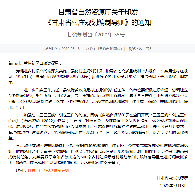 為深入貫徹習(xí)近平總書(shū)記視察甘肅重要講話和指示精神,落實(shí)省委、省政府關(guān)于村莊規(guī)劃工作部署,促推鄉(xiāng)村振興戰(zhàn)略深入實(shí)施,指導(dǎo)各地高質(zhì)量編制“多規(guī)合一”實(shí)用性村莊規(guī)劃。近日,由甘肅省自然資源廳牽頭組織,甘肅省城鄉(xiāng)規(guī)劃設(shè)計(jì)研究院有限公司參與起草的《甘肅省村莊規(guī)劃編制導(dǎo)則》正式印發(fā)實(shí)施。