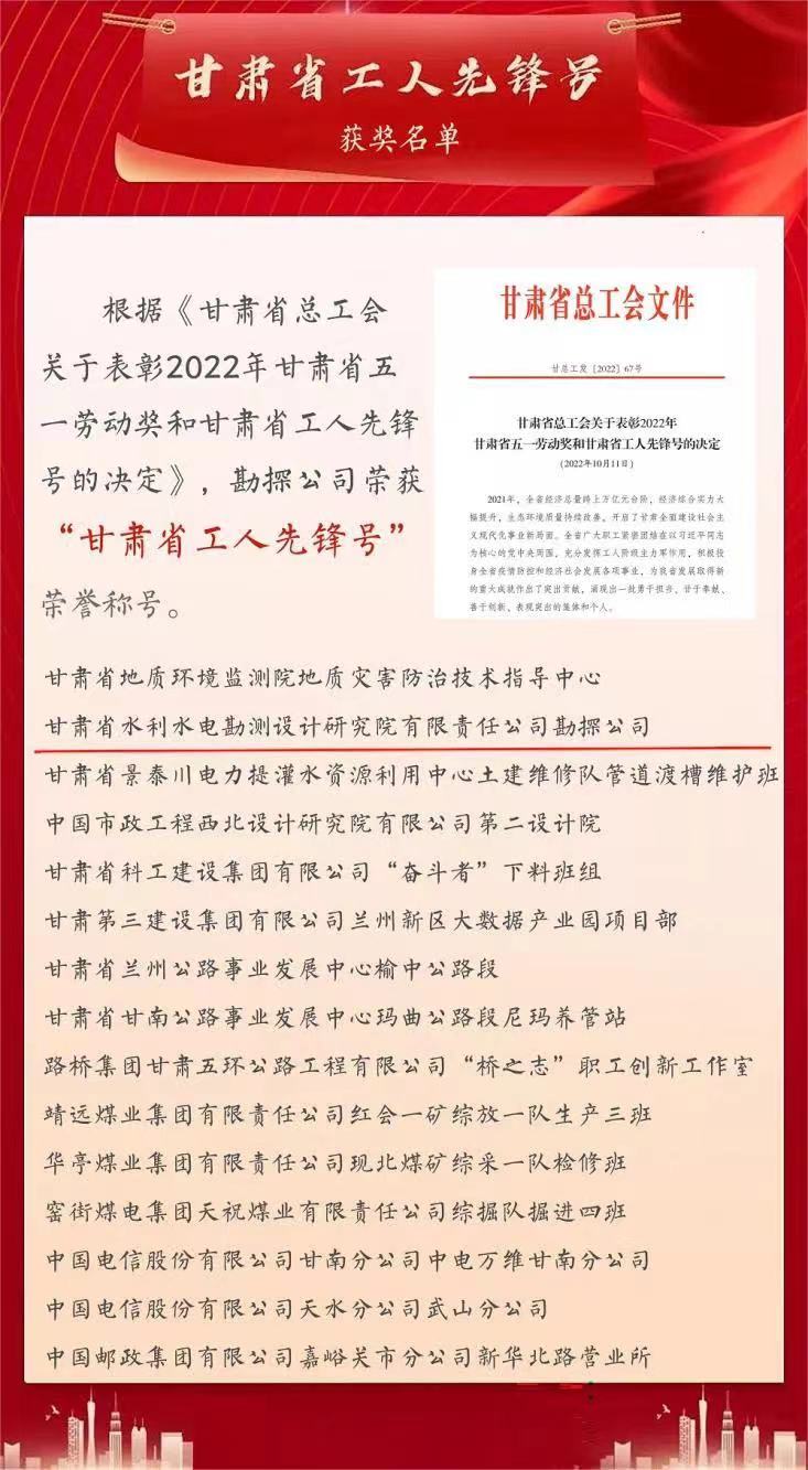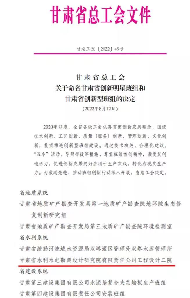 近日,甘肅省總工會發(fā)布2022年度“甘肅省工人先鋒號”和“甘肅省創(chuàng)新型班組”名單,甘肅省水電設(shè)計院的勘探公司榮獲2022年度“甘肅省工人先鋒號”稱號,工程設(shè)計二院榮獲“甘肅省創(chuàng)新型班組”榮譽(yù)稱號。