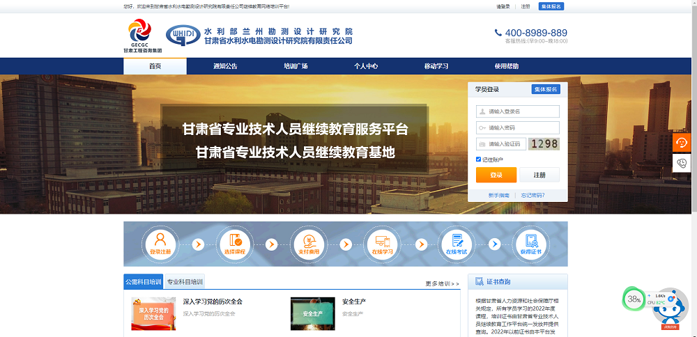 目前,平臺已正式上線,網(wǎng)址為:http://gsgczx.lllnet.cn/。學(xué)員可在平臺購買課程后,通過PC端、移動客戶端等多渠道開展遠程學(xué)習。完成學(xué)習任務(wù)并考核合格,即可獲得基地發(fā)放的培訓(xùn)證書,該培訓(xùn)證書是甘肅省人力資源與社會保障廳認可的學(xué)分證明。平臺可供2萬余人學(xué)習,擁有注冊登錄、報名繳費、在線學(xué)習及考核(支持PC端和移動客戶端)、證書打印、后臺管理等功能?,F(xiàn)有公需、專業(yè)課程4000余門,其中基地開發(fā)自制水利類課程4門10學(xué)時,能夠滿足各類專業(yè)技術(shù)人員的繼續(xù)教育學(xué)習。