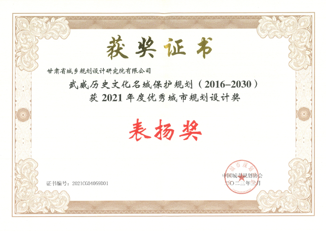 近期,由省規(guī)劃設(shè)計院編制的《武威歷史文化名城保護(hù)規(guī)劃(2016-2030)》項目榮獲全國“2021年度優(yōu)秀城市規(guī)劃設(shè)計獎”表揚獎,為我省歷史文化名城保護(hù)專業(yè)類唯一獲獎項目。