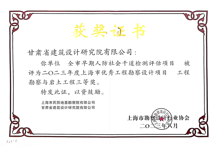 本次獲獎項目由省建筑設計院檢測中心聯(lián)合上海市民防地基勘察院有限公司,就蘭州市七八十年代人防社會干道開展檢測鑒定。項目獲獎,彰顯了省建筑設計院在工程勘察設計和檢測鑒定方面的創(chuàng)新能力和技術(shù)水平,也是對公司檢測業(yè)務板塊整體運營效率、綜合服務能力的再一次肯定。