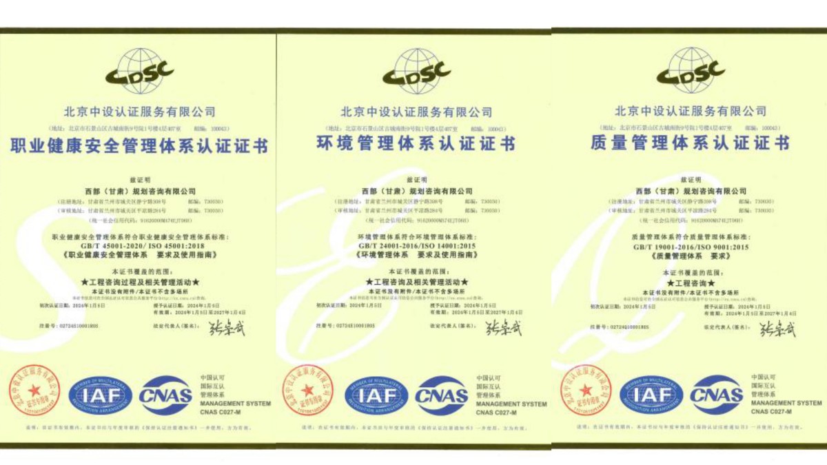 近日,經(jīng)北京中設(shè)認(rèn)證服務(wù)有限公司評審,西部(甘肅)規(guī)劃咨詢有限公司順利通過ISO9001質(zhì)量管理體系、ISO14001環(huán)境管理體系、ISO45001職業(yè)健康安全管理體系認(rèn)證并取得證書。