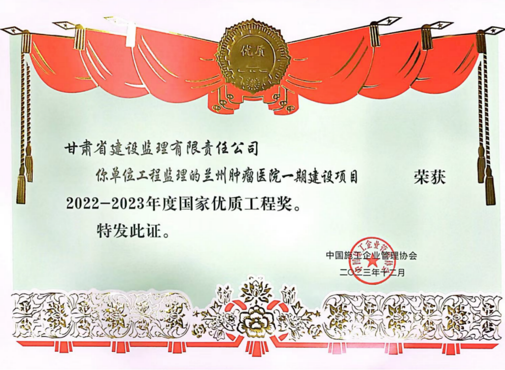 近日,經(jīng)中國施工企業(yè)管理協(xié)會(huì)評(píng)審,省建設(shè)監(jiān)理公司監(jiān)理的蘭州腫瘤醫(yī)院一期建設(shè)項(xiàng)目榮獲2022-2023年度國家優(yōu)質(zhì)工程獎(jiǎng)。此前,該項(xiàng)目已先后榮獲甘肅省建設(shè)工程文明工地、2021-2022年度甘肅省建設(shè)工程飛天獎(jiǎng)、2022-2023年度國家優(yōu)質(zhì)工程獎(jiǎng)。